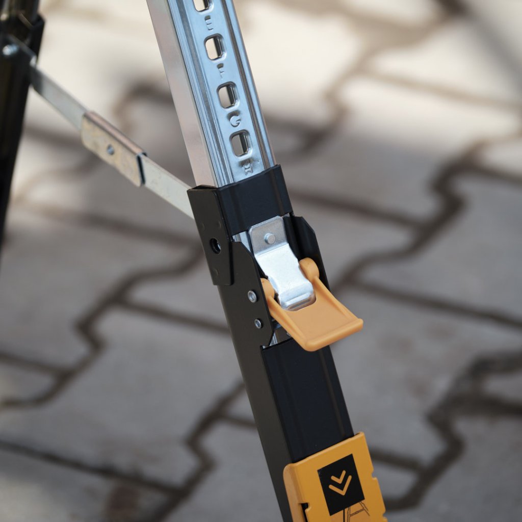 Strongbold H700 oferă stabilitate fără egal pe terenuri dificile, datorită mecanismului de picioare telescopice reglabile separat, care pot fi fixate în 9 poziții diferite. Când este complet extinsă, oferă o suprafață de lucru stabilă, cu o înălțime de până la 82 cm. Construcție robustă și de înaltă calitate din oțel de calitate superioară, cu finisaj vopsit cu pulbere în câmp electrostatic pentru durabilitate maximă. Suprafața superioară antiderapantă previne mișcarea nedorită a oricărui material. Mânerul adâncit și mecanismul practic de pliere fac capra de lucru ușor de transportat.